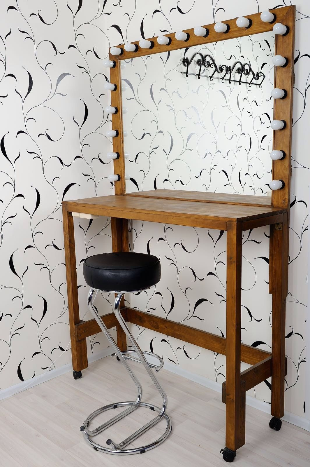 Гримерная оснащена удобным передвижным профессиональным столом визажиста с регулируемым освещением по периметру зеркала, дополнена тумбой для визажиста, стулом для визажиста, зеркалом во весь рост, гладильной доской, утюгом с отпаривателем. В штате студии имеется профессиональный стилист, который окажет дополнительные услуги по созданию образа. Для удобства клиентов в гримерной имеется все необходимое для фотосессии: разнообразные костюмы, шляпы, парики, платья, разнообразный реквизит для фотосъемки.