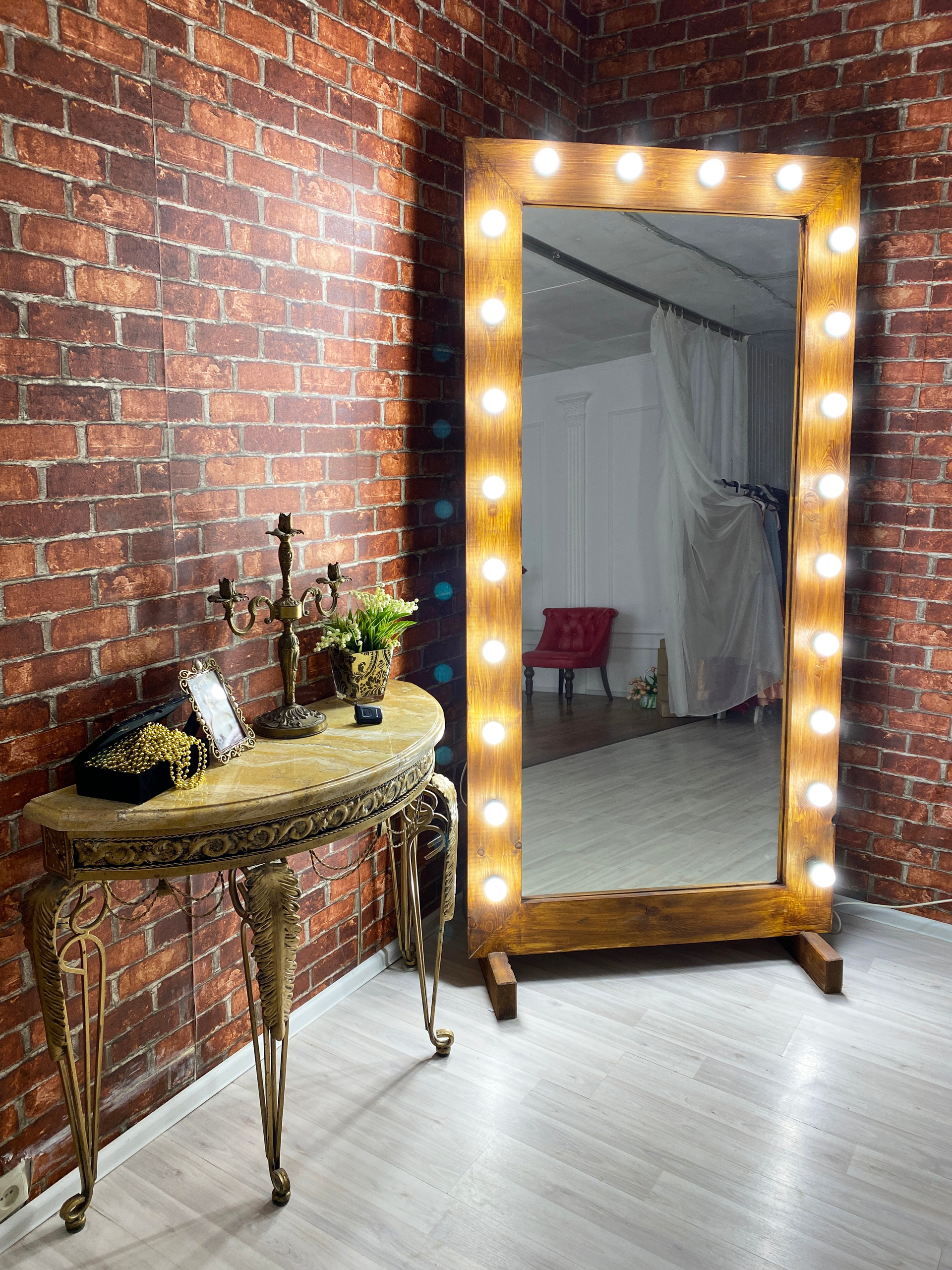Локация, где царит настроение артхауса и уюта. Глубокие коричневые шторы blackout создают эффект полной изоляции от внешнего мира и помогают выстроить выразительный свет. Зеркало в полный рост с лампами словно сошло с гримерной комнаты киноактрисы — оно отражает вас с каждой стороны, усиливая образ и добавляя драматизма.